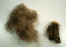 @右が洗い終わったフリース、左がカーディングするためにほぐした毛です。カーダーは細かい針が植え込まれていて、その針でひっかけて毛の繊維を整えるのでなるべく毛を傷めないようにほぐしておきました。