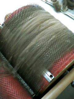 Aドラムカーダーの吸い込み口におき、ハンドルを回して毛を引き込みます。その後、右と左のローラーで毛を引っ張り合いながら繊維の向きを揃えていきます。