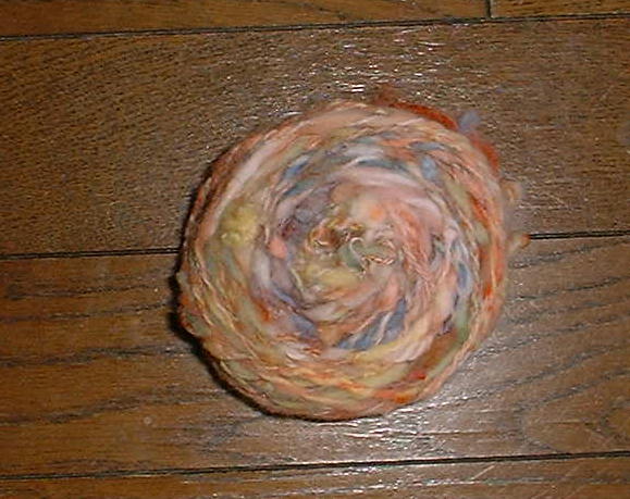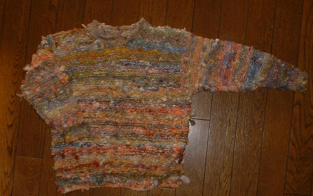 ポロワスのセーターポロワスのスカードをレインボー染めして紡ぎ、ぽこぽこしたネップがかわいいせーターになりました。全部裏編みで、袖口とえりぐりはロールになるように表編みで編んであります。上の写真が紡いだ状態の糸です。2002年12月完成
