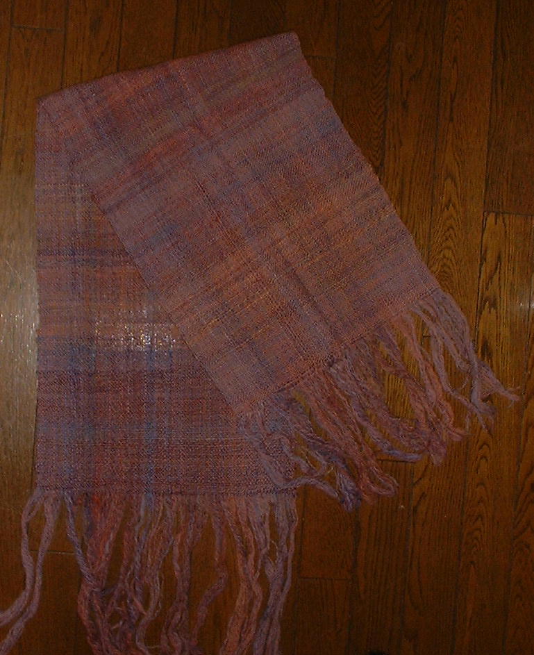 メリノのレインボー染めショールメリノトップをレインボー染めして、ピンク〜紫っぽいグラデーションの部分だけ取り出して紡いだ糸で織ったマフラーです。 遠目に見るとブルーのラインが規則的に入っているようです。 2002年10月