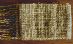 織り講座の課題でしたが、手紡ぎ糸で織りたいと思い、奮闘しました。タマネギ染めのアルミ媒染(黄色)と鉄媒染(深緑)を使いました。染めたのはペレンデール鎌倉さん扱いのWool